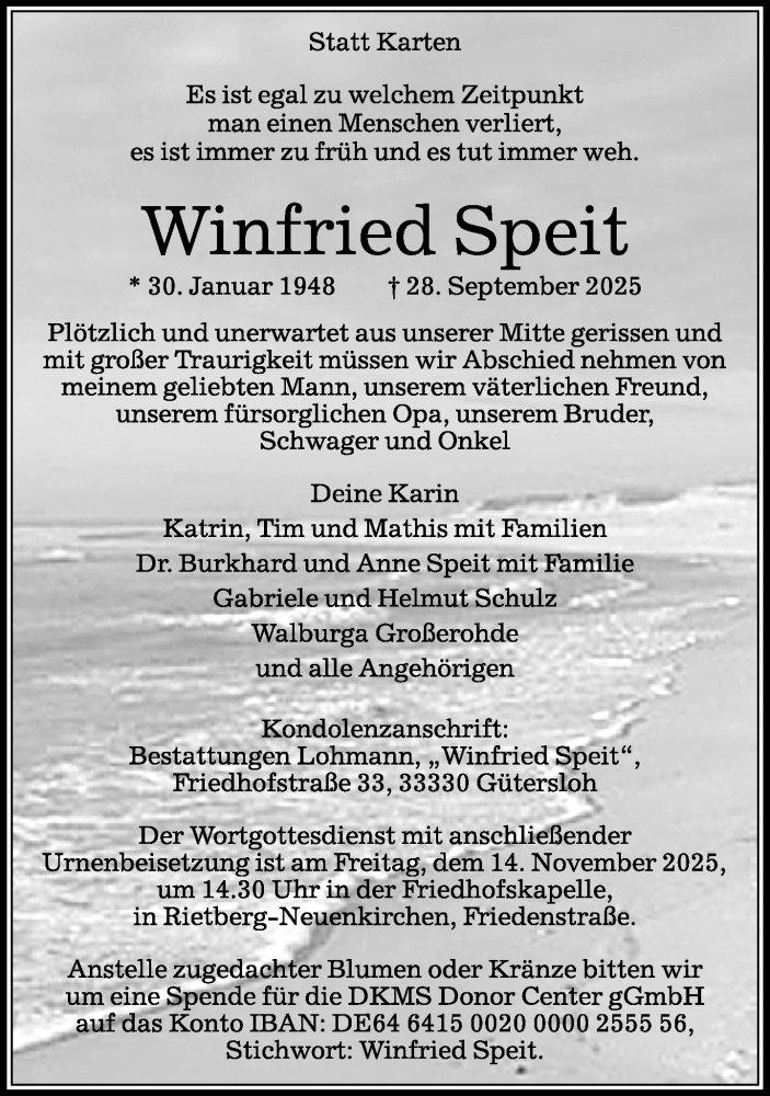 Hier finden Sie alle Traueranzeigen aus der Zeitung, die bisher für Winfried Speit erschienen sind. Weitere Traueranzeigen, die in der Zeitung erscheinen, werden hier ebenfalls aufgelistet