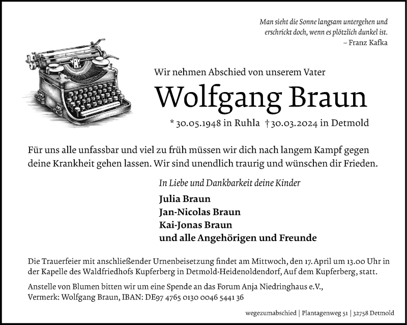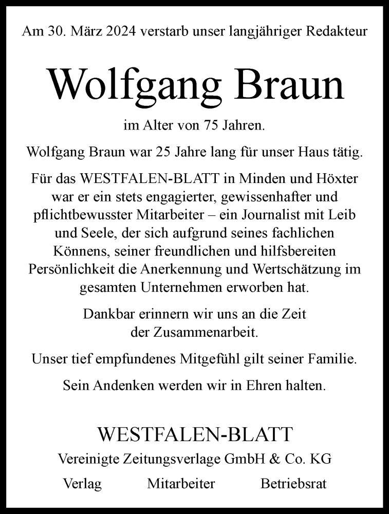 Hier finden Sie alle Traueranzeigen aus der Zeitung, die bisher für Wolfgang Braun erschienen sind. Weitere Traueranzeigen, die in der Zeitung erscheinen, werden hier ebenfalls aufgelistet