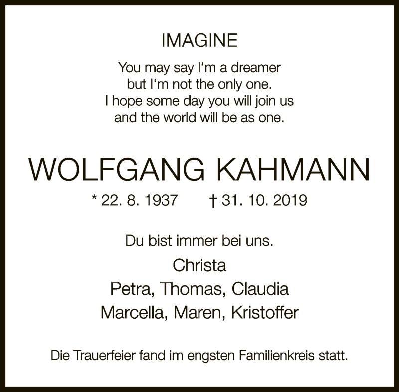 Hier finden Sie alle Traueranzeigen aus der Zeitung, die bisher für Wolfgang Kahmann erschienen sind. Weitere Traueranzeigen, die in der Zeitung erscheinen, werden hier ebenfalls aufgelistet